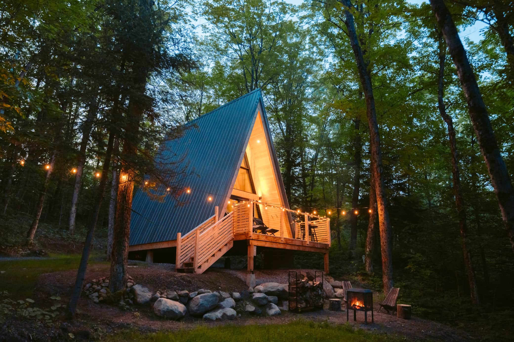 The cabin glowing at dusk, in the heart of the forest. Photo credit: @rollingvan